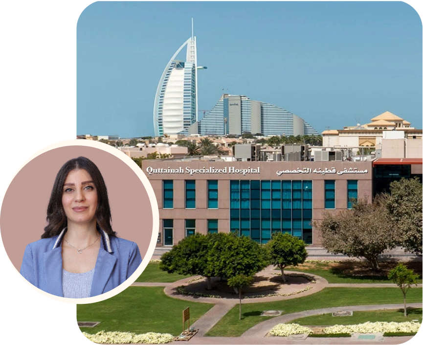 تستقبلكم د. سارة يعقوب في عيادتها ضمن قسم Q‑Derma، المتخصص بأمراض الجلد والعلاجات التجميلية، في الطابق الأول من مشفى قطينة التخصصي في جميرا – دبي، أحد أبرز وجهات الطب التجميلي في الإمارات.